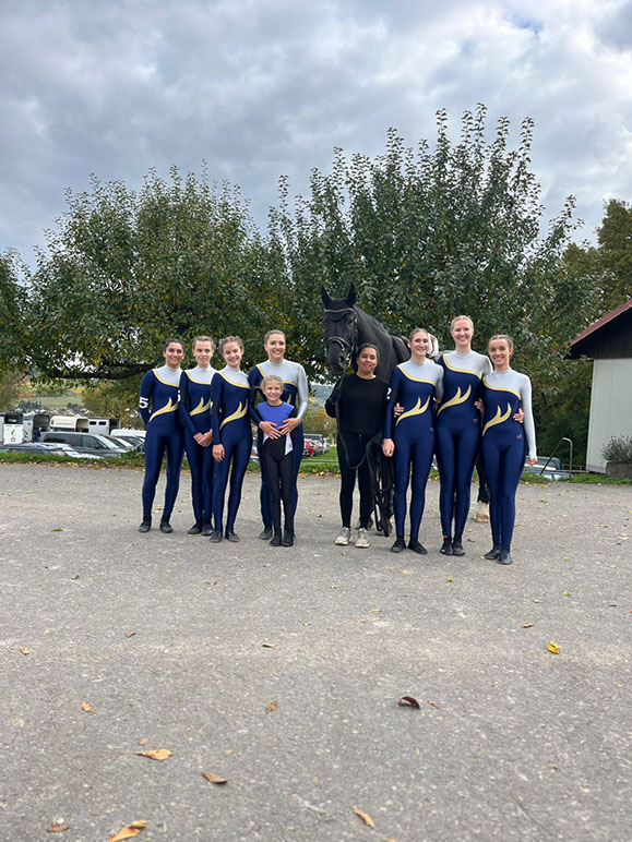 Am Sonntag, 29.09.2024, startete eine der Samstagsgruppen auf dem Voltigierturnier beim Reit- und Fahrverein Wiesloch. Die Voltis, Trainerinnen, Helferinnen und auch Amber, das Pferd, waren mächtig aufgeregt, denn es war eine Premiere. Früh morgens trafen sich alle im Stall, um die Voltis und Amber schick zu machen. Danach ging es los nach Wiesloch. Dort schauten sie zunächst ein bisschen den anderen Startern zu, bevor es ans Aufwärmen und Ablongieren ging. Anschließend ging es auch schon los. Die Einlaufmusik ertönte und Amber, die Voltis und ihre Trainerinnen liefen in den Wettkampfzirkel ein. Sie starteten in einem Schritt- Schrittwettbewerb, d.h., dass die Pflicht sowie die Kür im Schritt geturnt wurden. Zunächst hat jede Voltigiererin ihre Pflichtübungen präsentiert, bevor die Kür, bestehend aus Doppelübungen, gezeigt wurde. Alle Voltis und auch Amber haben ihr Bestes gezeigt und wurden für ihre tolle Leistung mit dem dritten Platz belohnt.